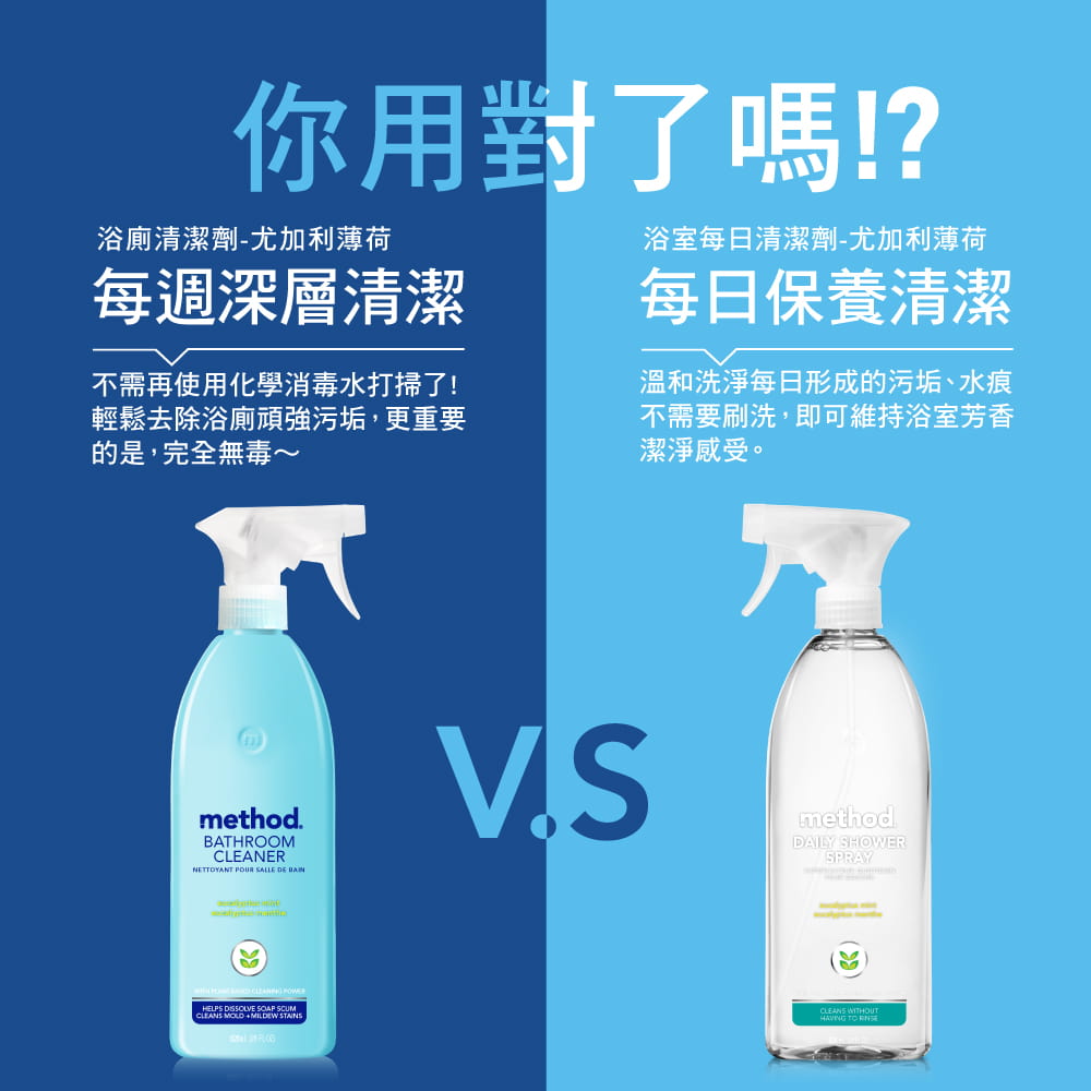 浴廁抗菌清潔劑具有殺菌功效,但清潔去污垢力卻沒有浴廁清潔劑那麼強,這也是為什麼我們建議有很頑強或是累積已久的污垢,還是得先清洗再使用浴廁抗菌清潔劑。如果兩瓶都想擁有,那麼就請你每個月使用浴廁抗菌清潔劑 2~3 次就好,或是視情況使用囉! 剩下的浴廁清潔就交給浴廁清潔劑即可 !
